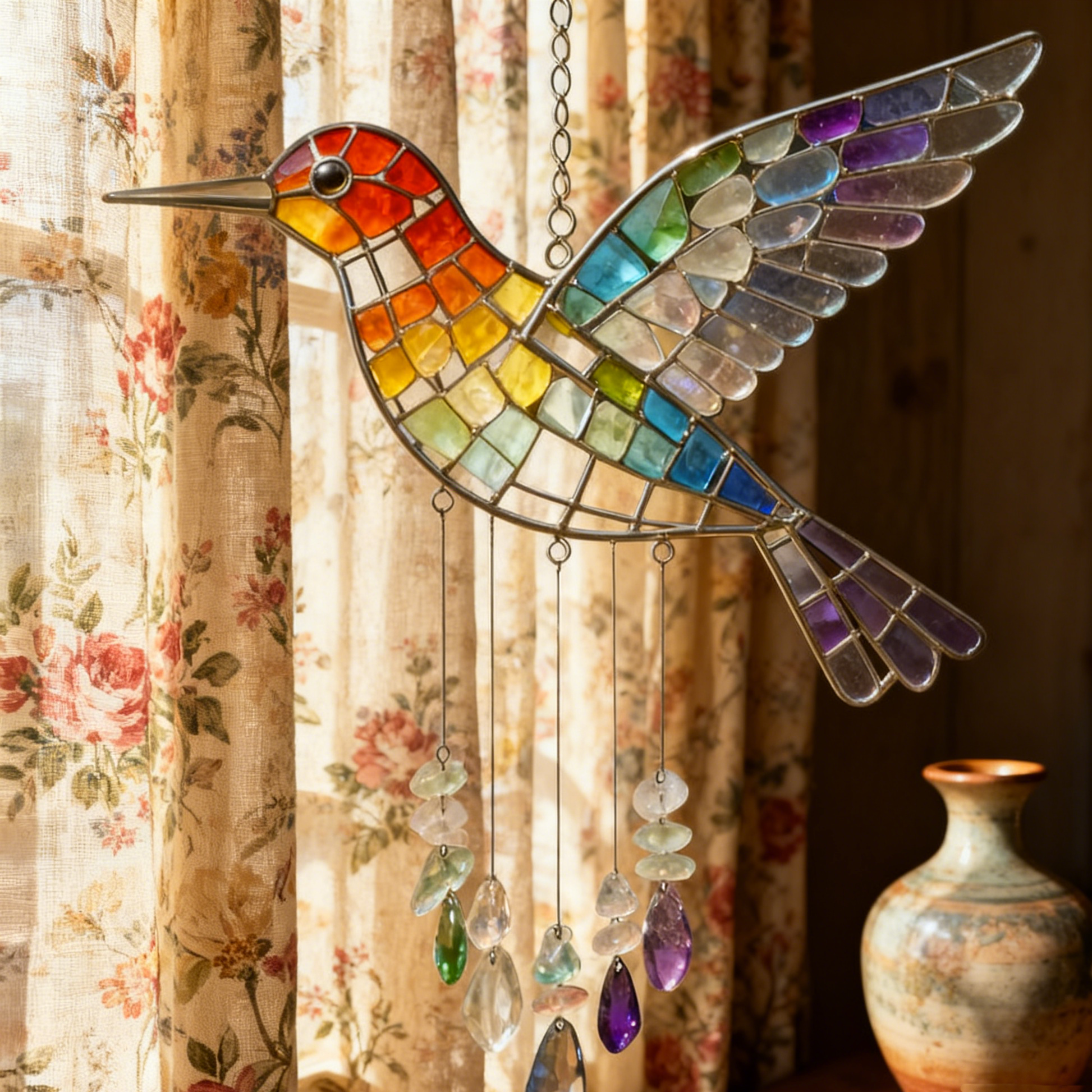 🌈Meaning:The hummingbird symbolizes joy, resilience, and the beauty of living in the moment, while the rainbow sea glass embodies hope, renewal, and the magic of nature’s leftovers. Together, they tell a story of transformation—turning ocean-tumbled glass into a work of art, and ordinary spaces into havens of color and sound. It’s a reminder to embrace life’s little joys and find beauty in unexpected places.