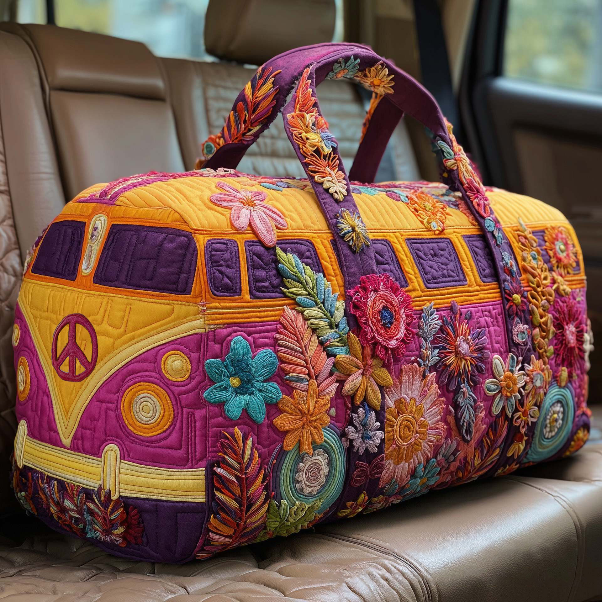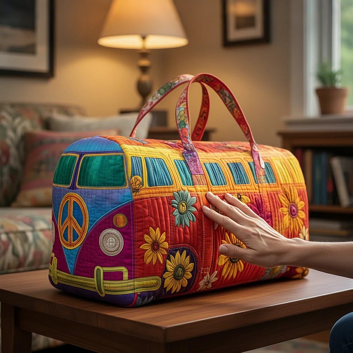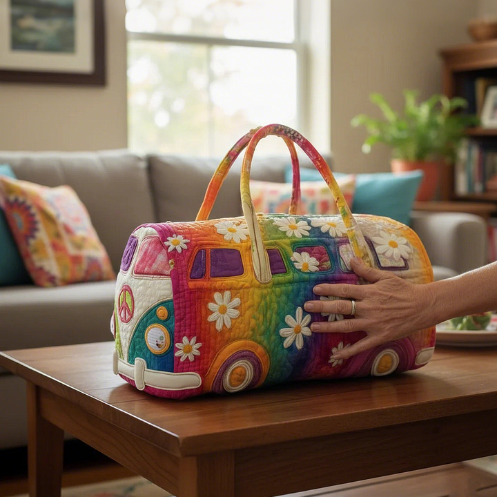 Tired of boring luggage? It's time to make your journey a spectacle. This 'Vintage Bus' is covered with rainbows, flowers, and peace symbols isn't just a travel bag—it's a mobile manifesto of joy. Crafted from soft, puffy quilted fabric and intricate textile appliqués, it captures the free spirit of a road trip and the romantic hues of a hippie era, ready to accompany you to every memorable destination.